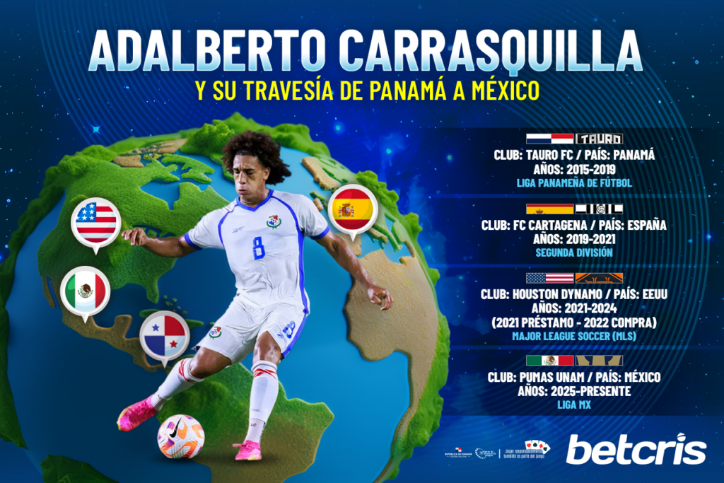 Adalberto Carrasquilla pertenece al equipo mexicano Club Universidad Nacional de la Primera División de México, además de ser un futbolista panameño internacional con la selección de Panamá.